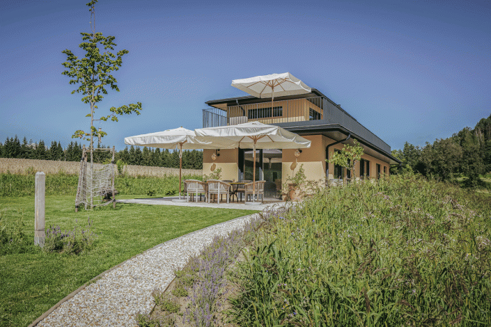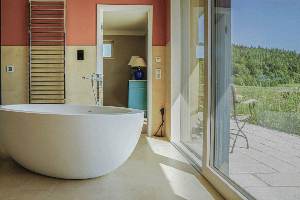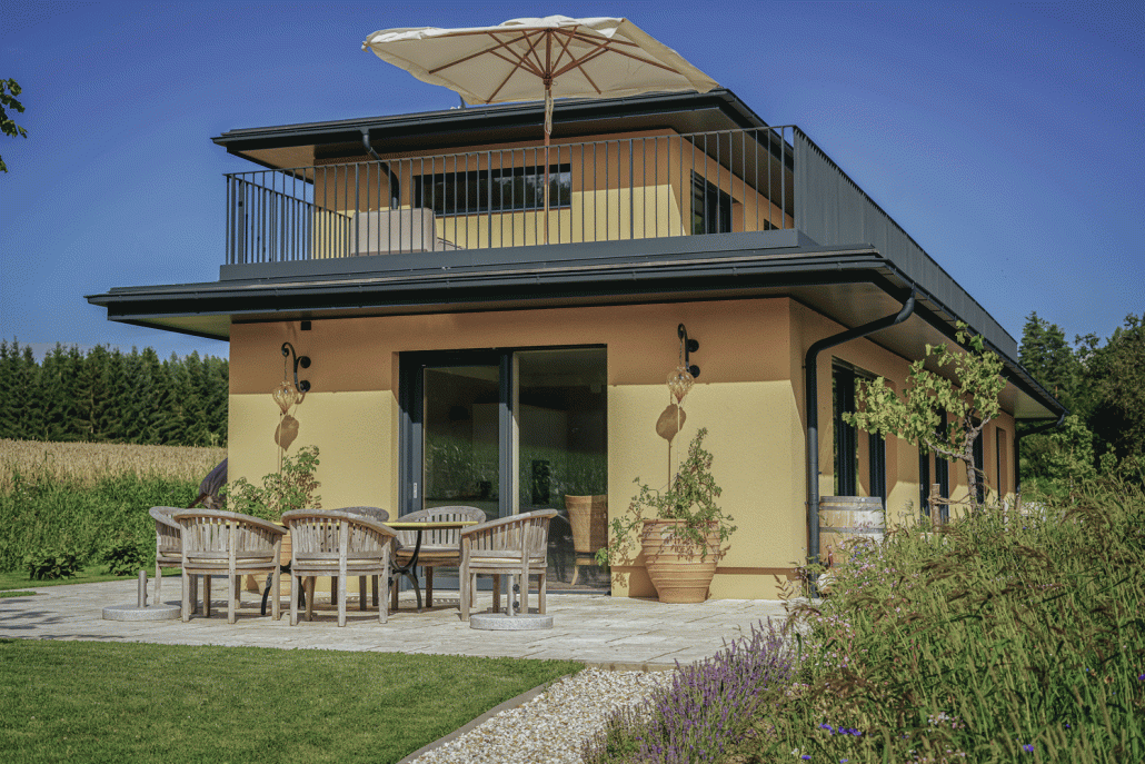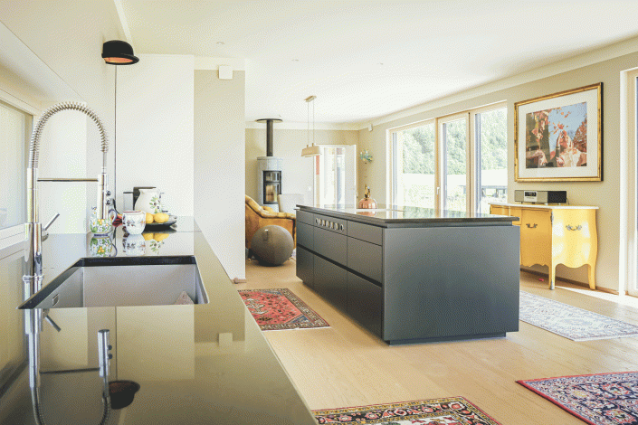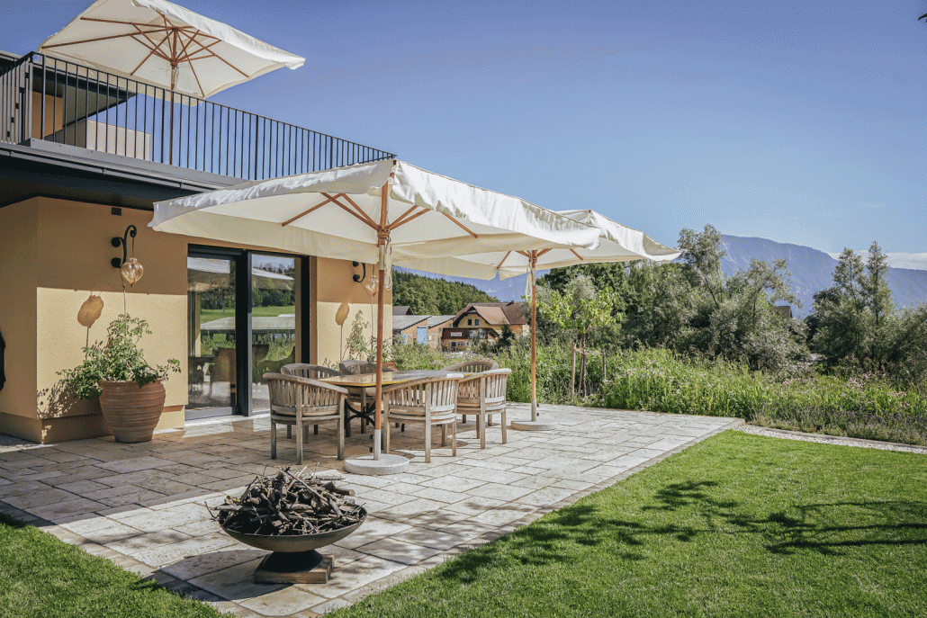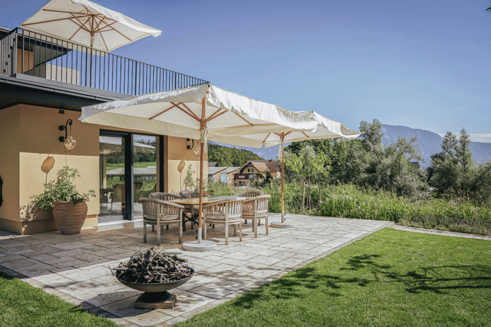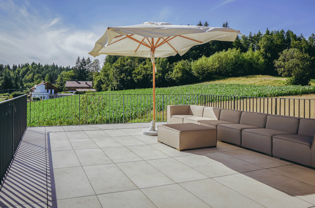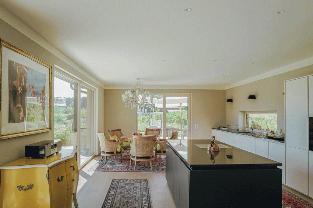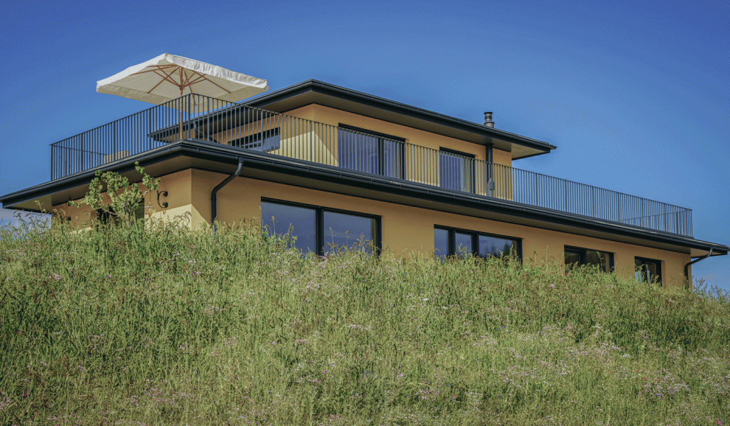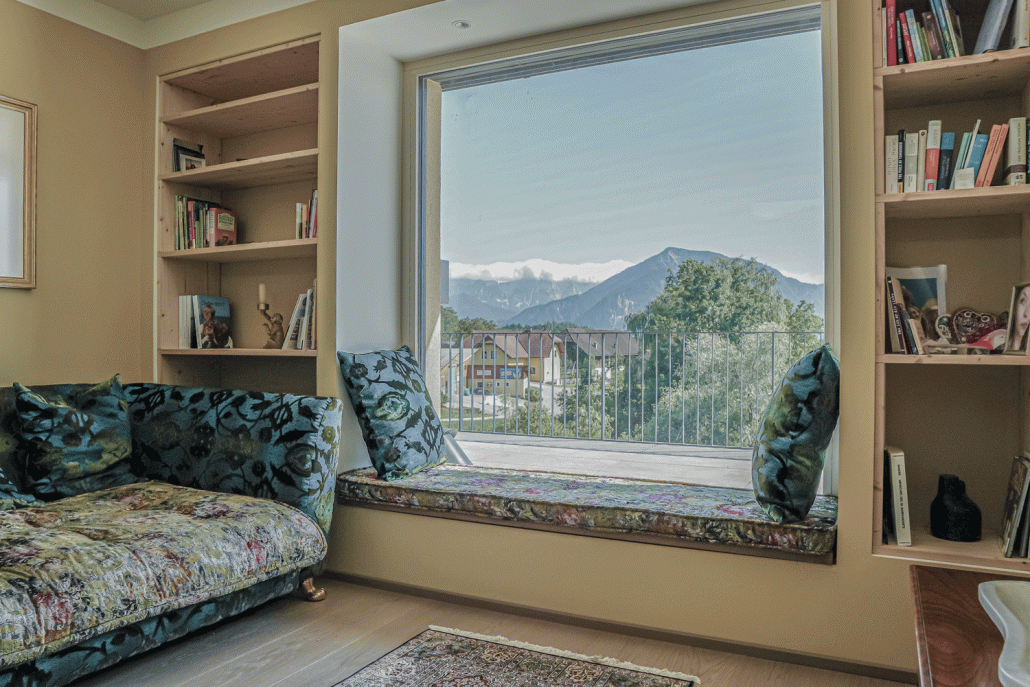 Doppelter Genuss: exklusives Interieur und ein überwältigender Ausblick auf die Berglandschaft von einer dominant großen Dachterrasse,