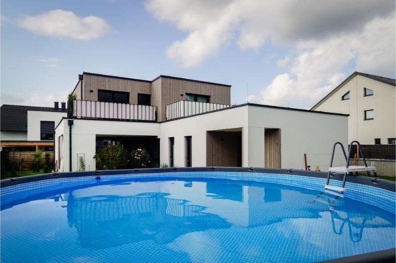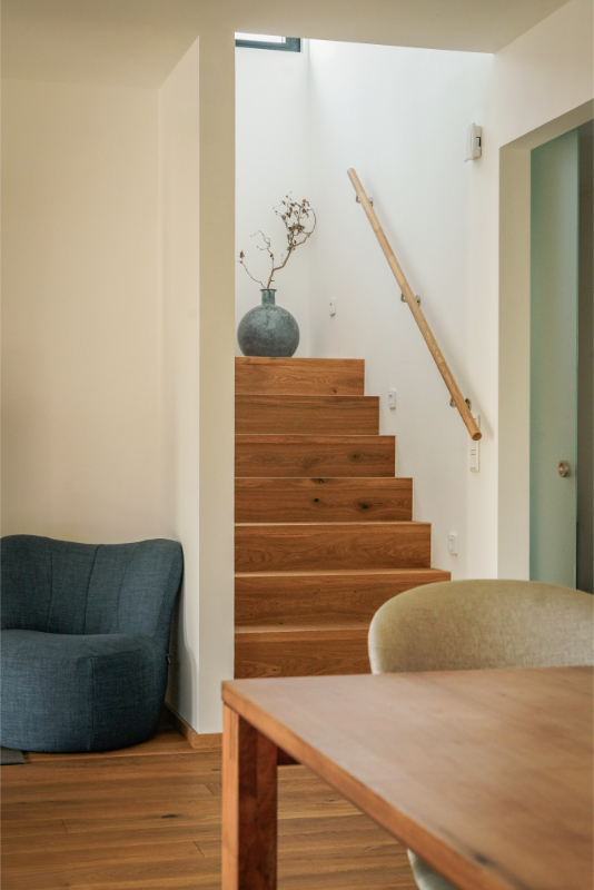 Der Grundriss in L-Form schützt vor unerwünschtem Einblick, der Fassadenmix aus Holz und Putz gibt Struktur.
