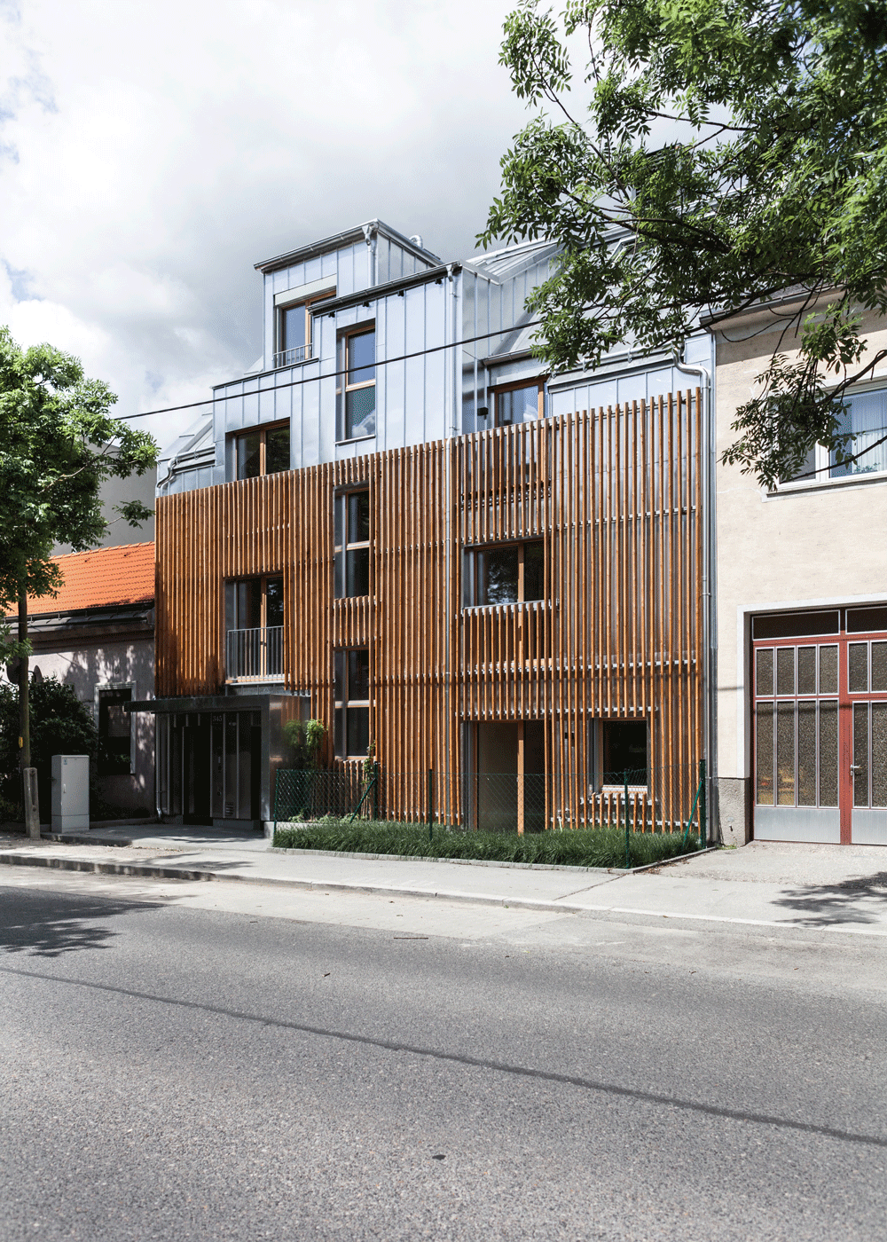 Die Fassade wird aus einer geschlossenen Lärchenschalung gebildet. Beim Haus 345 wird einer straßenseitigen Blechfassade ein Lärchen-Rankgerüst vorgesetzt.